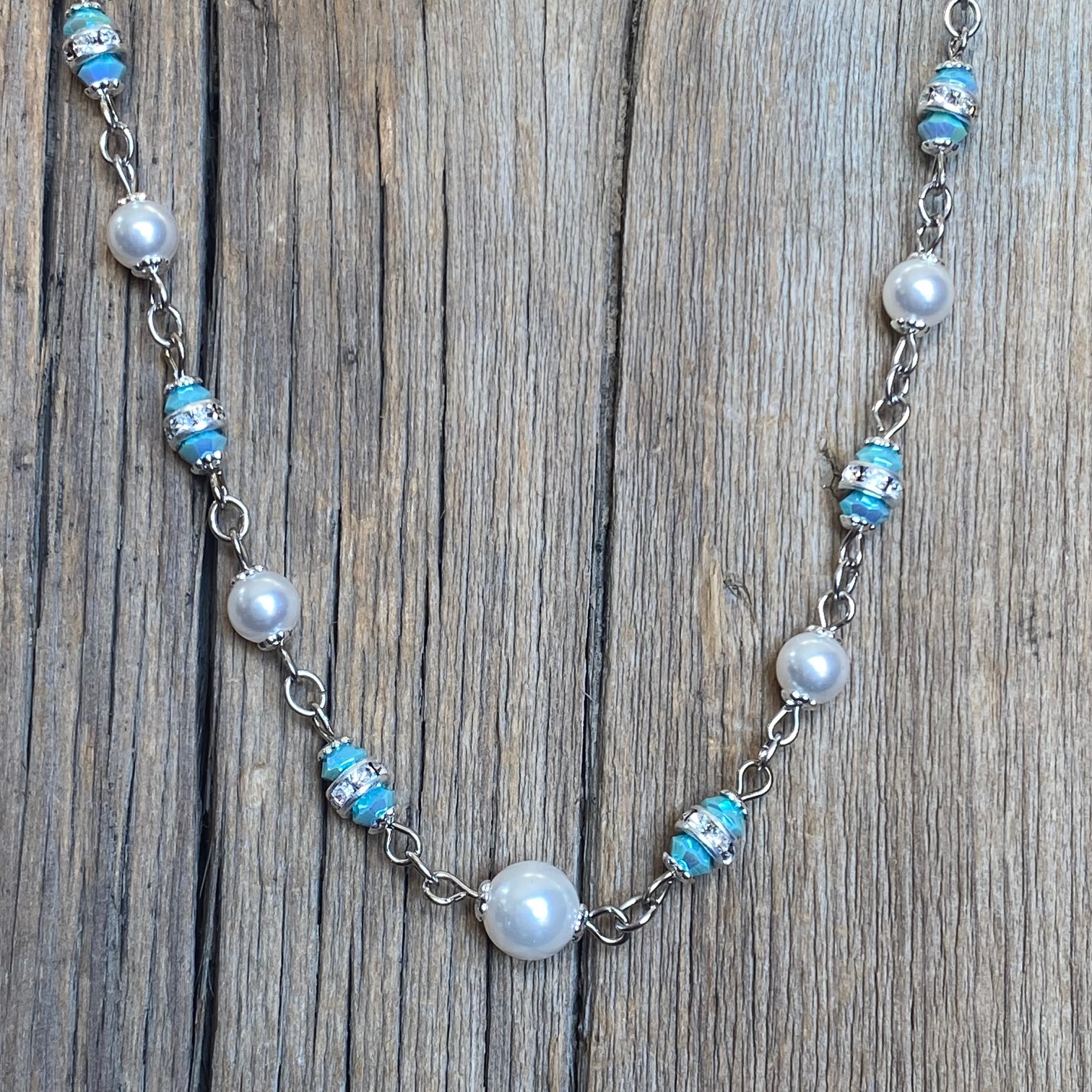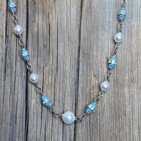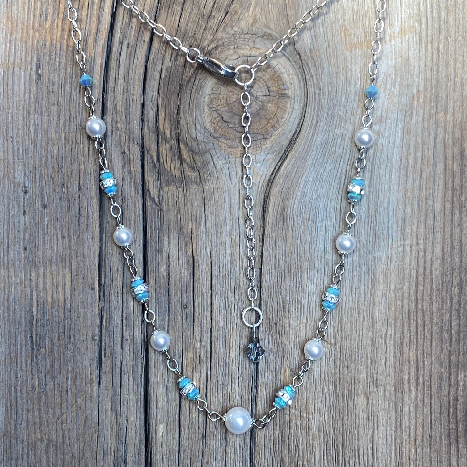 Silver chain features a string of glossy pearls, sparkling Bohemian crystals and silver accents. Lobster clasp. 17 inches long with a 3-inch extender. Find companion pieces in our Big Sky Collection.
