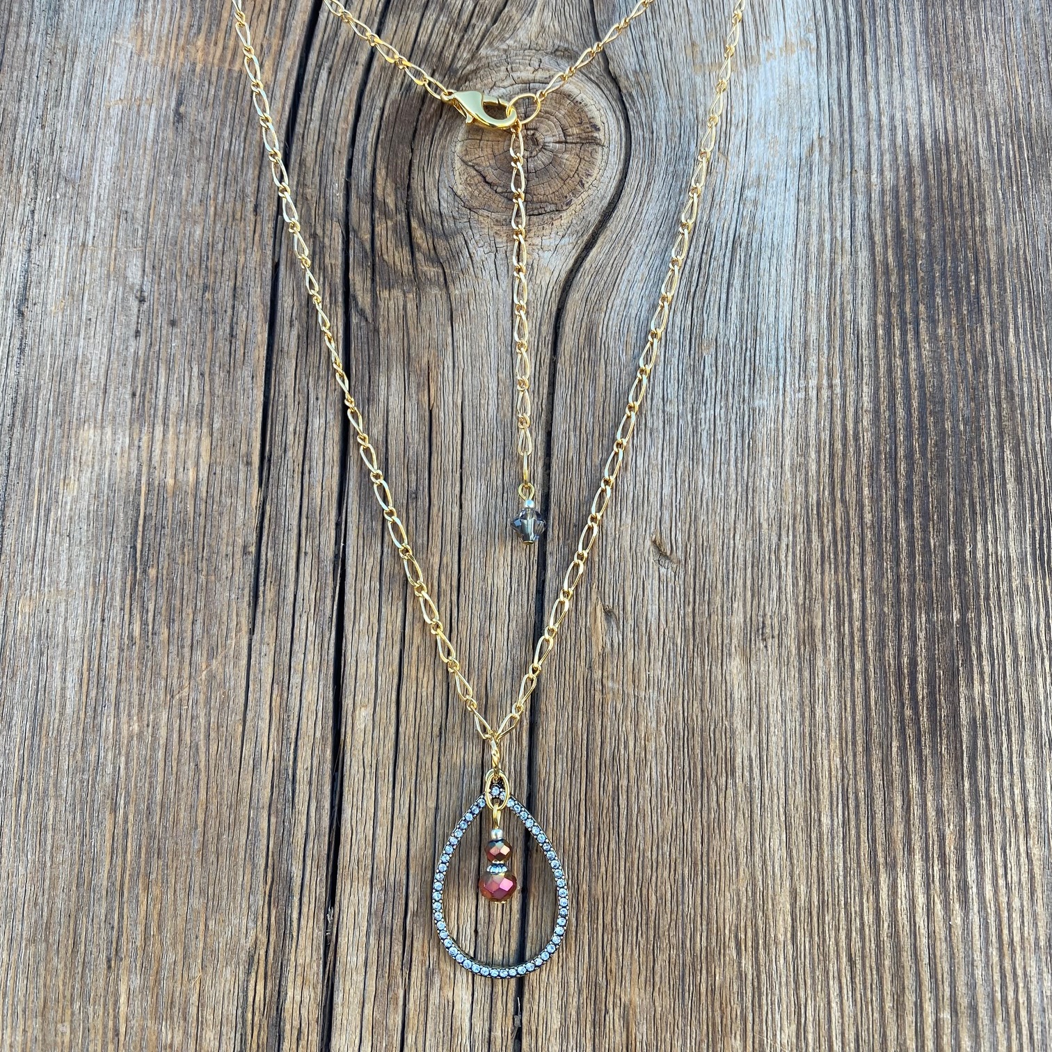 Glossy gold chain features a sparkling crystal-studded teardrop encircling a drop of gorgeous Bohemian crystals. Lobster clasp. Chain is 17 inches long with a 3-inch extender. Teardrop measures 1 1/2 inches long. Find companion pieces in our Champagne & Roses Collection.