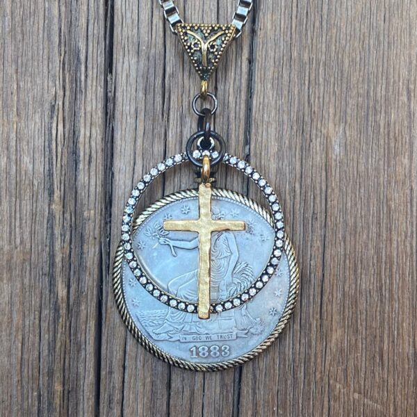 An antique brass chain features a replica of a U.S. Trade Dollar minted in 1883. The coin is embellished with a rhinestone-studded ring and a hammered gold cross. Lobster clasp. Chain measures 18 inches with a 3-inch extender. Coin measures 1 1/2 inches in diameter. Find companion pieces in our “In Him” Collection.
