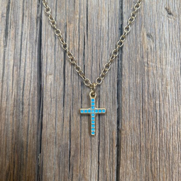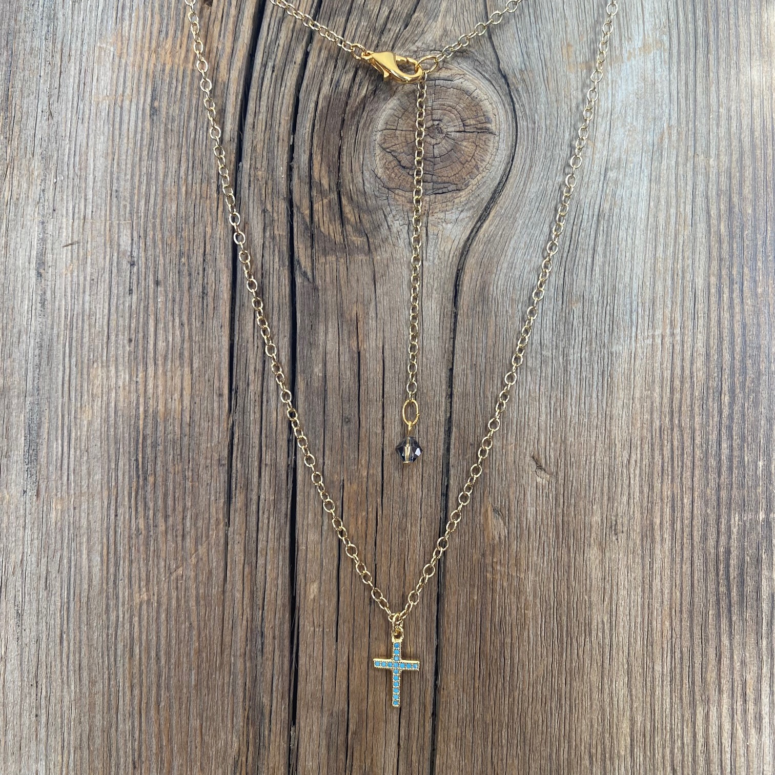 A simple gold chain features a tiny beaded cross. Lobster clasp. Chain measures 17 inches with a 3-inch extender. Find companion pieces in our “In Him” Collection.