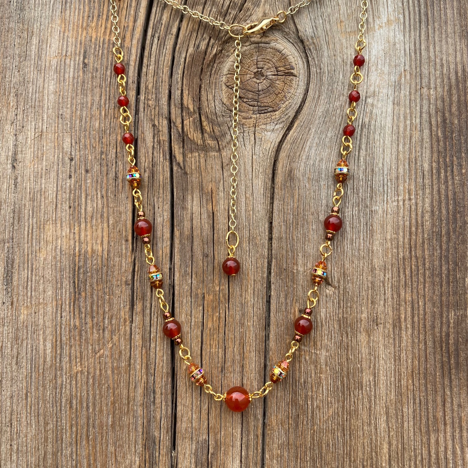 A simple gold chain features glossy, luminous carnelian beads, sparkling Czech crystals & warm gold accents. Lobster clasp. Chain measures 17 inches long with a 3-inch extender. Find companion pieces in our Indian Summer Collection.