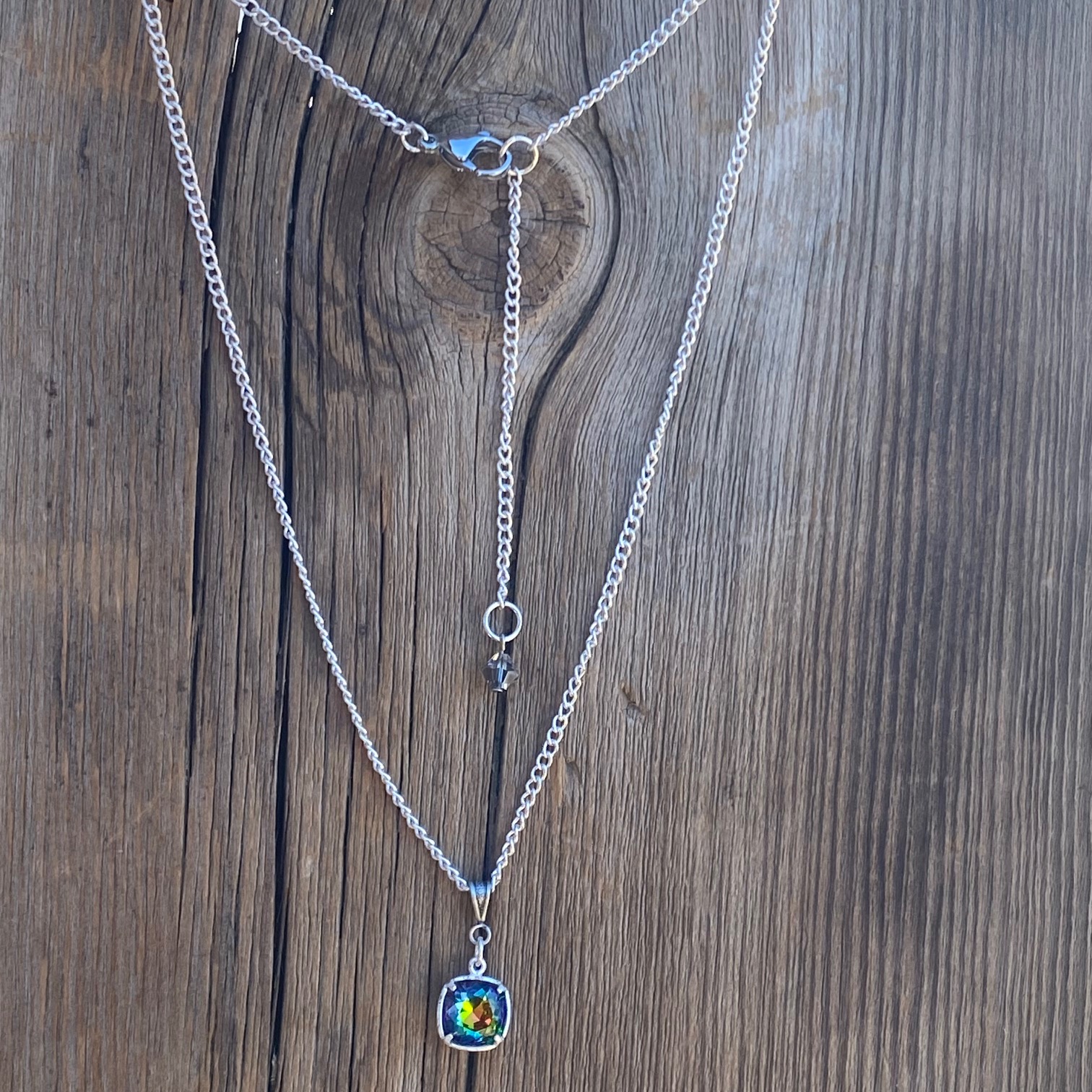 Simple silver chain features a stunning Swarovski “cushion” crystal. The chain is 17 inches long with a 3-inch extender. Lobster clasp. Find companion pieces in our Margaritaville Collection.