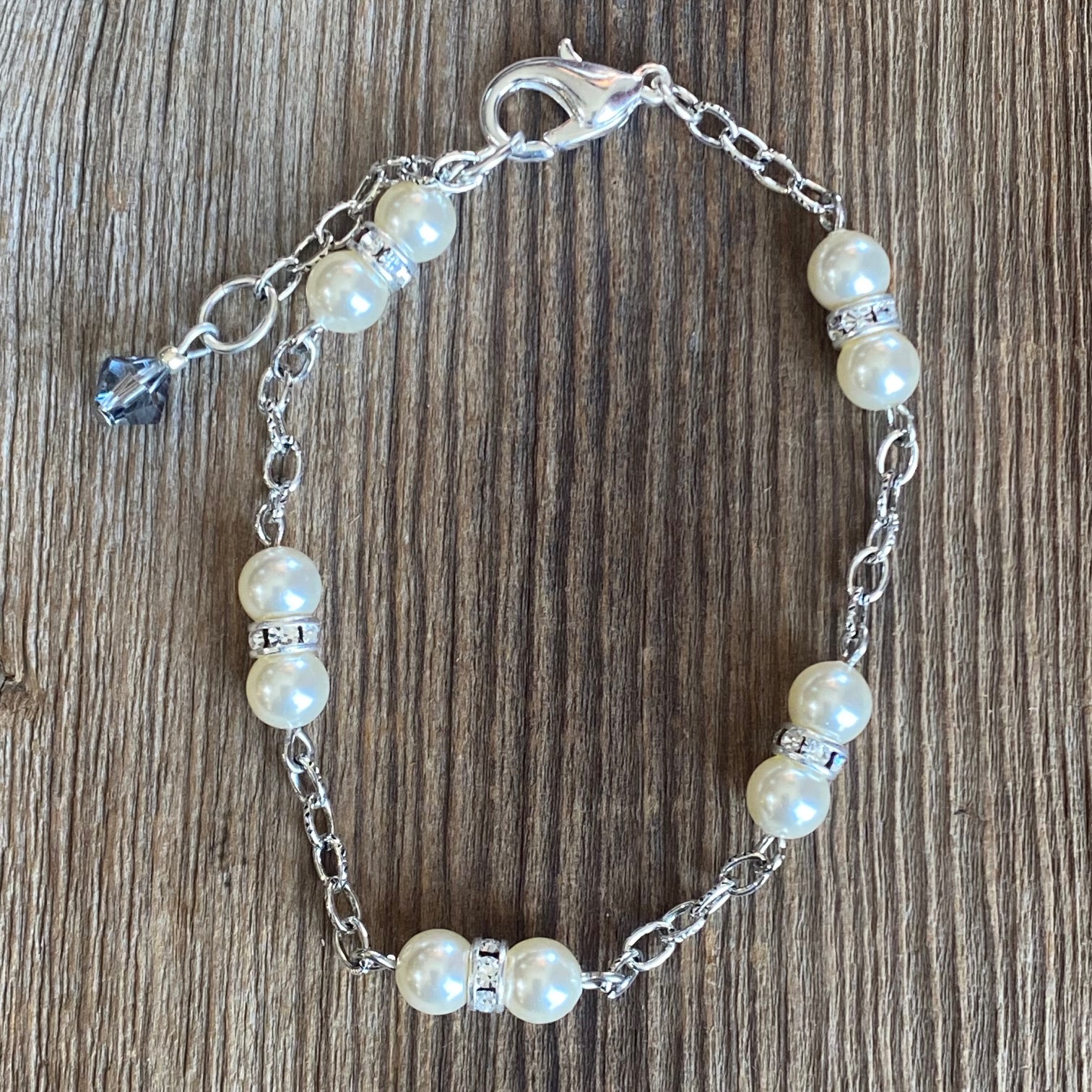Silver chain features glossy pearls and sparkling crystal rondells. Lobster clasp. 7 inches long extending to 8 1/4 inches. Find companion pieces in our Pearl on Ice Collection.