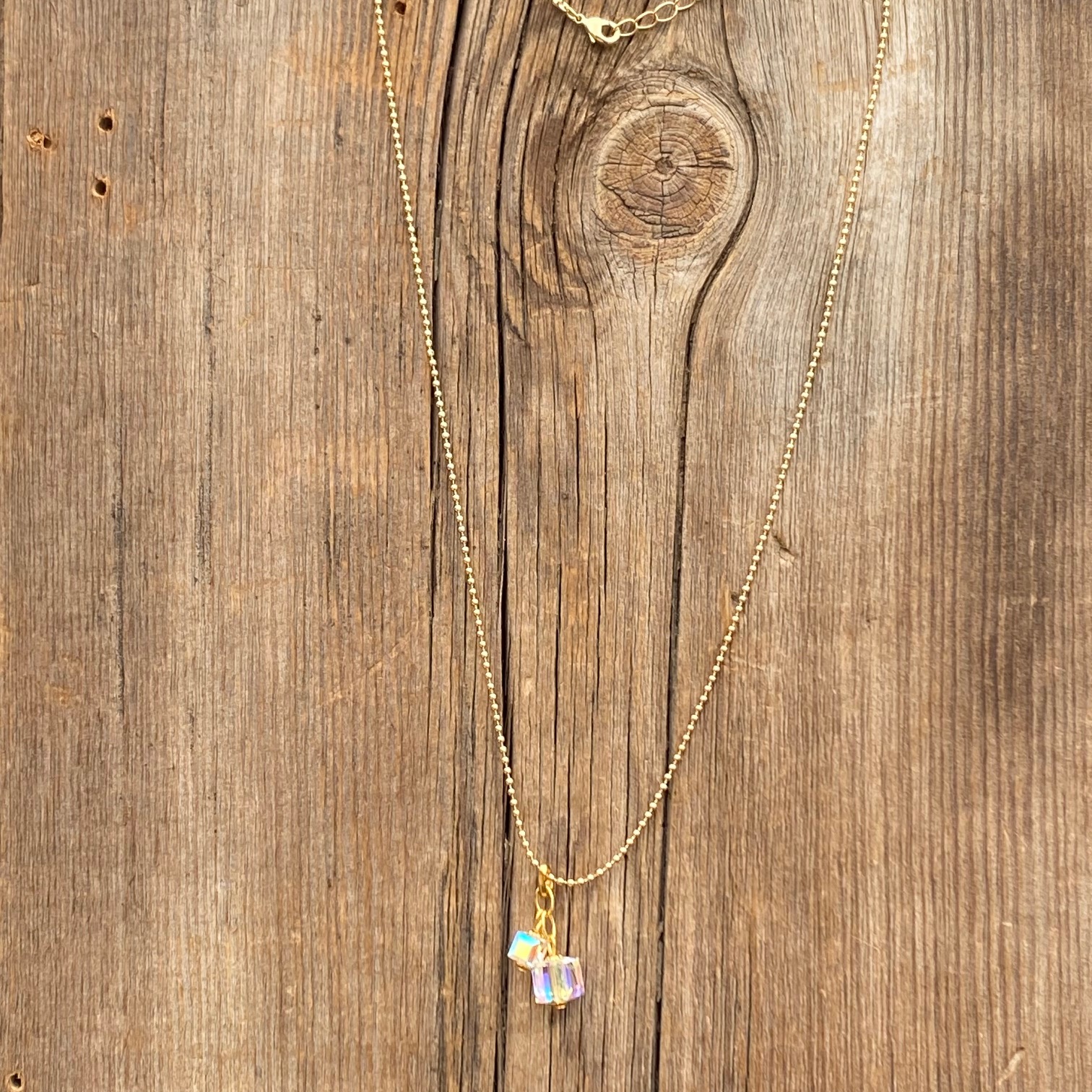 A tiny gold ball chain features a drop of two fabulous Austrian crystal cubes embellished with gold accents. Lobster clasp. Chain measures 18 inches long with a 1-inch extender. Drop measures 1 inch from chain. Find companion pieces in our Sun & Snow Collection.