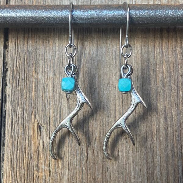 Hypo-allergenic surgical steel wires feature pewter elk antlers embellished with faceted turquoise cubes. 1 1/2 inches total length. Find companion pieces in our Wildlife Collection.